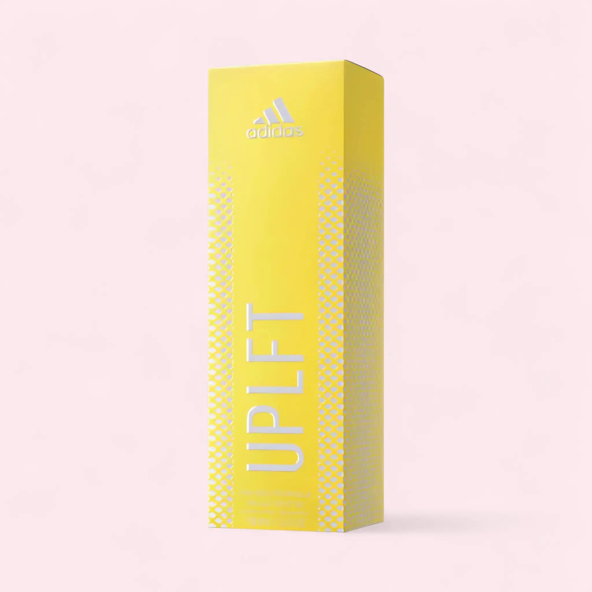 Adidas Culture of Sport Uplift Eau de Toilette 100ML for women's yellow packaging box with Adidas logo and 'UPLIFT' text on a light pink background | BEAUTE KNOWS AUSTRALIA