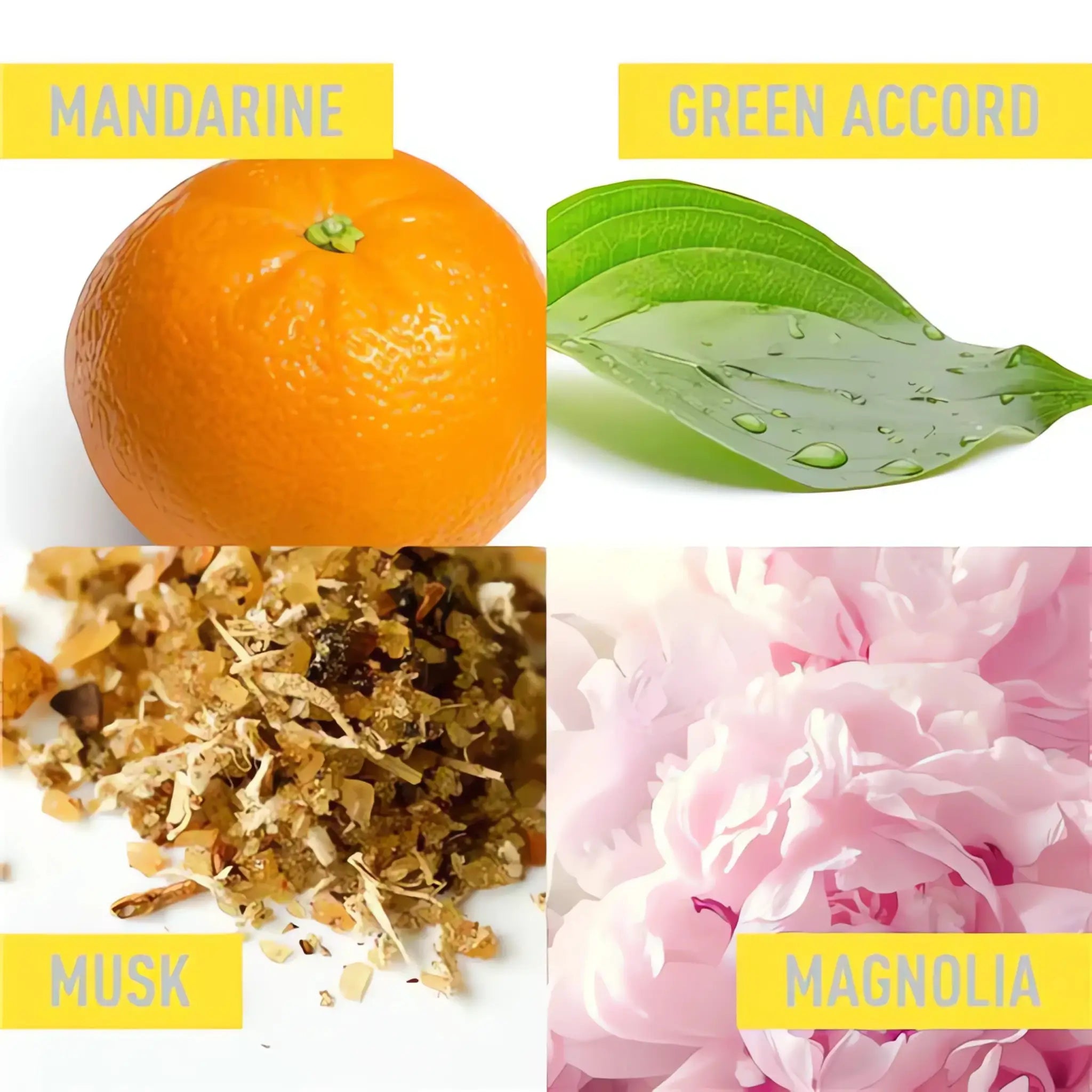 Top Notes: Yellow Mandarin, Green Notes and Bitter Orange — a sparkling citrus opening that radiates positivity and freshness.