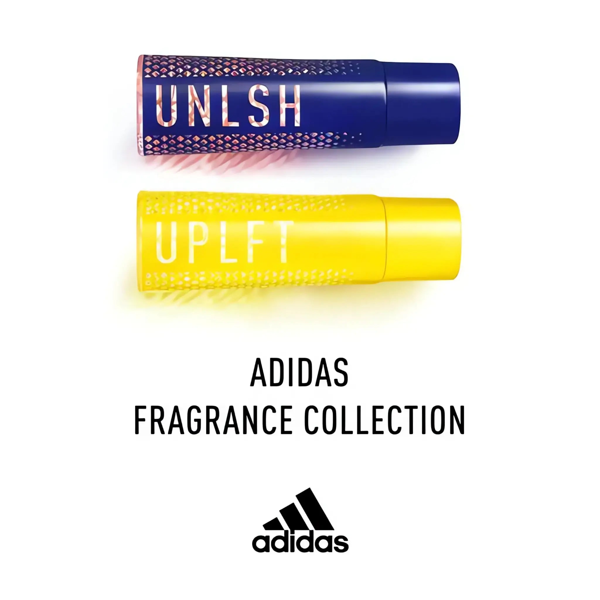 Adidas Culture of Sport Uplift Eau de Toilette 100ML and Adidas Culture of Sport Unleash Eau de Toilette 30ml spray bottle with 'UNLSH' and 'UPLFT' text on a white background, featuring the Adidas logo | BEAUTE KNOWS AUSTRALIA