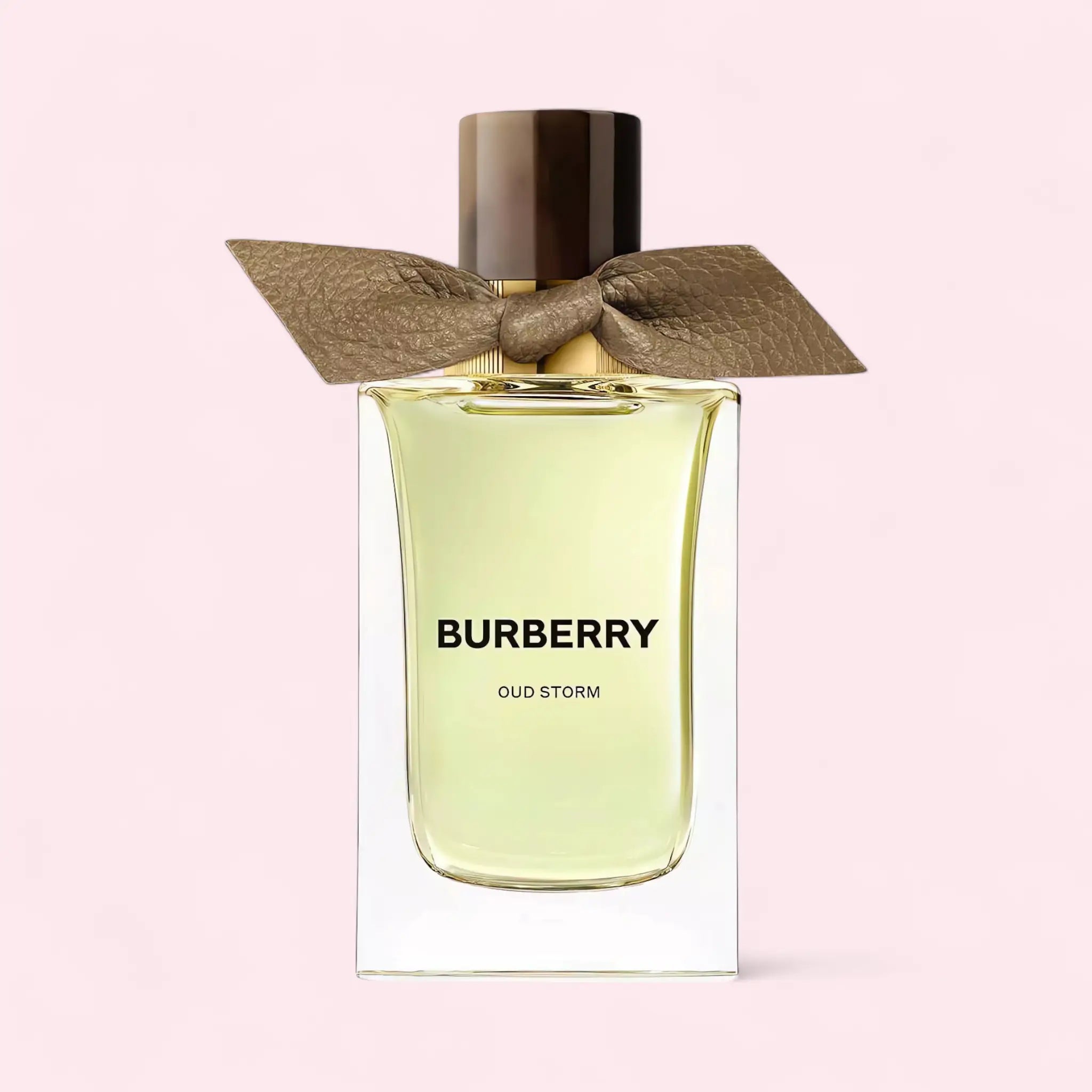 Burberry Oud Storm perfume bottle and packaging on a light pink background
