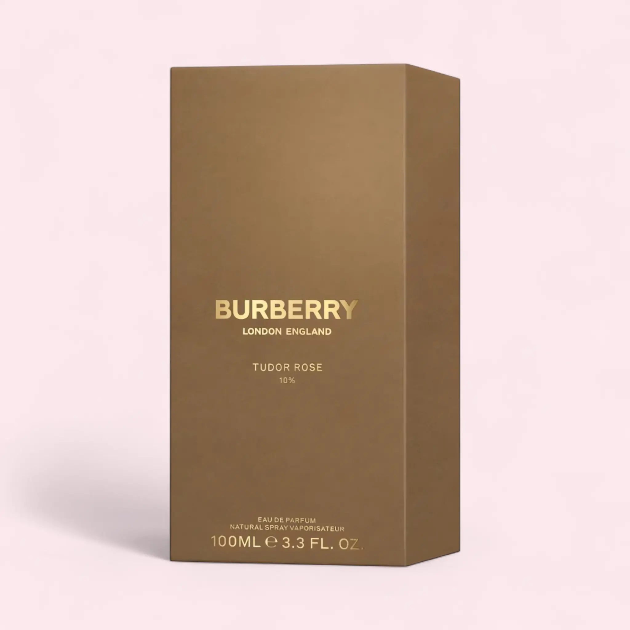 Burberry Tudor Rose perfume packaging on a light pink background