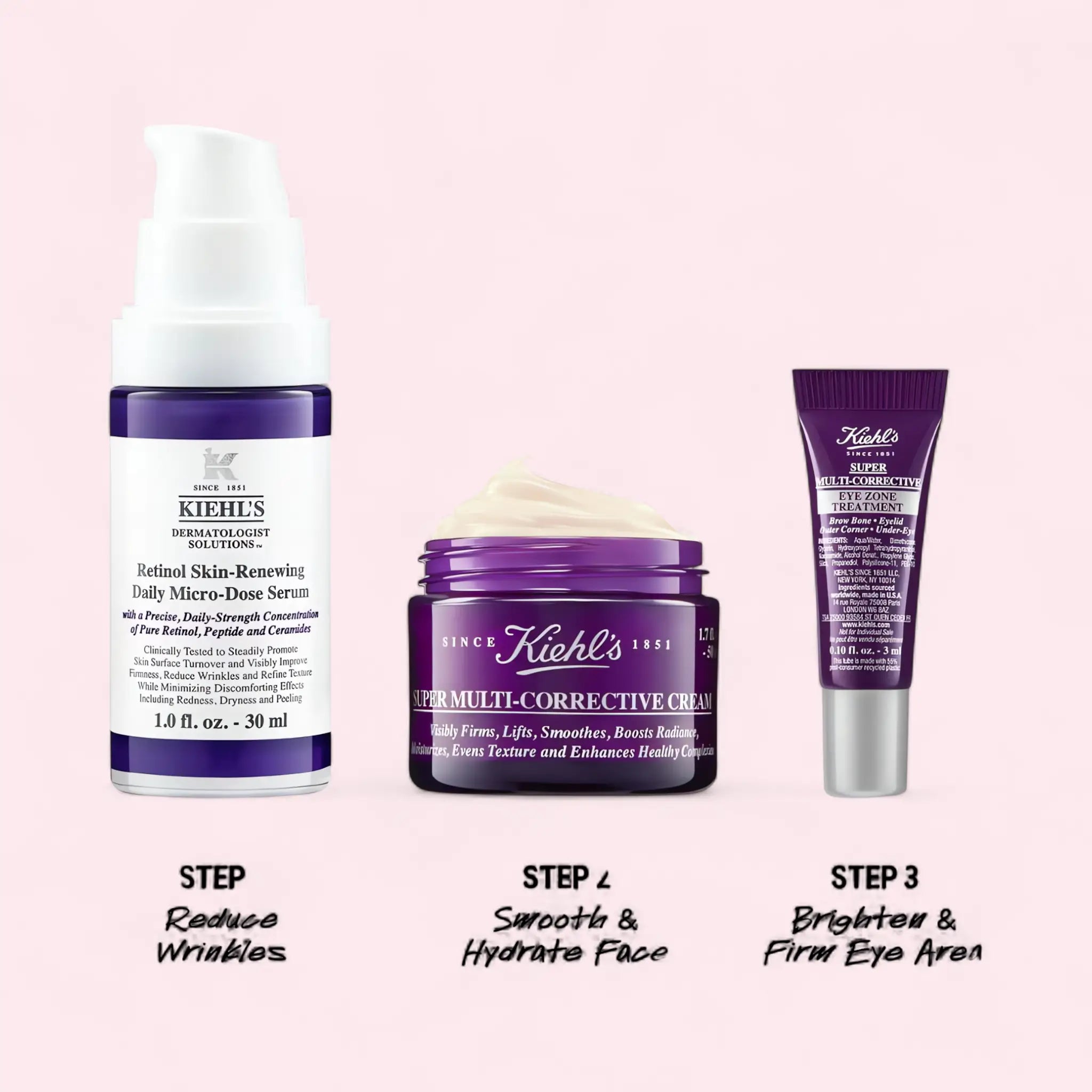 Retinol Skin-Renewing Daily Micro-Dose Serum: Aqua/Water, Glycerin, Dimethicone, Alcohol Denat., Hydroxyethylpiperazine Ethane Sulfonic Acid, Retinol, Ceramide NP, Acetyl Dipeptide-1 Cetyl Ester, Sodium Hyaluronate, Tocopherol, Caprylyl Glycol, Phenoxyethanol. Super Multi-Corrective Cream: Aqua/Water, Glycerin, Dimethicone, Hydroxypropyl Tetrahydropyrantriol (ProxylaneGX™), Sodium Hyaluronate, Chaga Mushroom Extract, Caprylyl Glycol, Tocopherol, Phenoxyethanol, Adenosine. Super Multi-Corrective Eye Zone Treatment: Aqua/Water, Glycerin, Niacinamide, Caffeine, Acetyl Dipeptide-1 Cetyl Ester, Sodium Hyaluronate, Caprylyl Glycol, Phenoxyethanol. (Ingredients may vary by batch. Please refer to the product packaging for the most accurate list.)