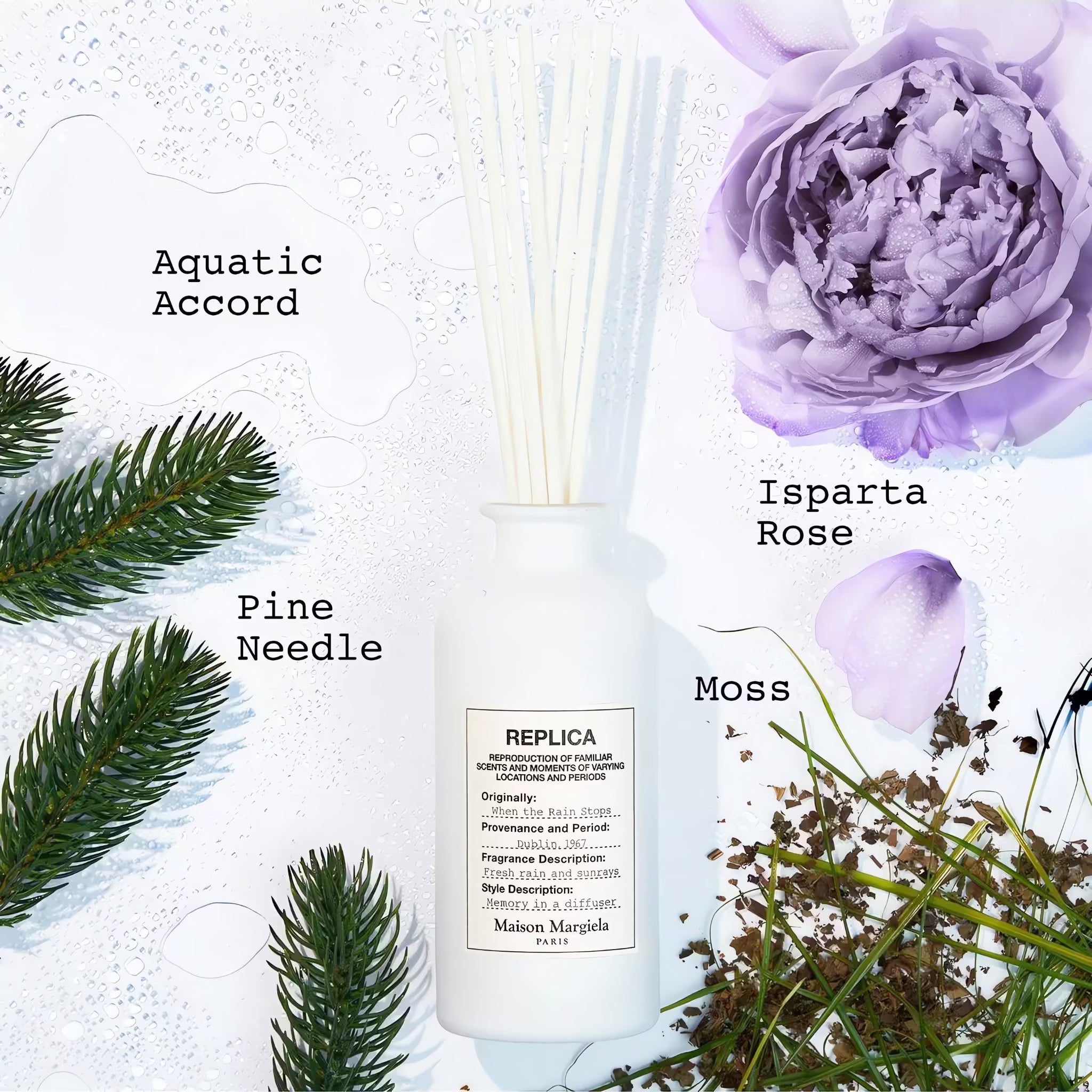Maison Margiela Replica When The Rain Stops Scented Diffuser 185ml is more than a home fragrance — it’s an experience of renewal and serenity. Its blend of aquatic florals, pine and moss evokes the purity of nature after rainfall, the scent of earth revived, and the calm that follows the storm.