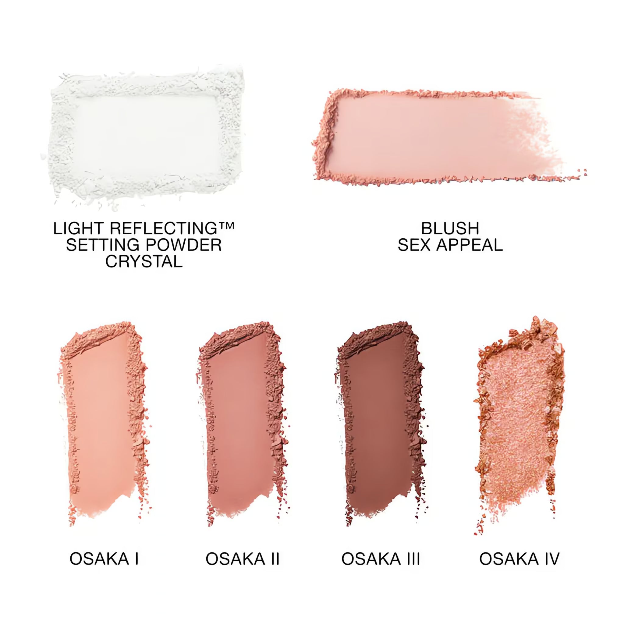 Light Reflecting™ Setting Powder (Translucent Crystal): Synthetic Fluorphlogopite, Silica, Dimethicone, Caprylyl Glycol, Glycerin, Tocopheryl Acetate, Aqua (Water), Phenoxyethanol, [+/- (May Contain): CI 77891 (Titanium Dioxide), CI 77491, CI 77492, CI 77499 (Iron Oxides)]. Light Reflecting™ Blush (Sex Appeal): Talc, Mica, Synthetic Fluorphlogopite, Dimethicone, Zinc Stearate, Caprylyl Glycol, Phenoxyethanol, Silica, Tocopheryl Acetate, Tin Oxide, [+/- (May Contain): CI 77891 (Titanium Dioxide), CI 77491, CI 77492, CI 77499 (Iron Oxides), CI 75470 (Carmine)]. Light Reflecting™ Quad Eyeshadow (Osaka I–IV): Talc, Mica, Dimethicone, Synthetic Fluorphlogopite, Caprylyl Glycol, Phenoxyethanol, Silica, Tin Oxide, Tocopheryl Acetate, [+/- (May Contain): CI 77891 (Titanium Dioxide), CI 77491, CI 77492, CI 77499 (Iron Oxides), CI 75470 (Carmine), CI 77007 (Ultramarines), CI 77510 (Ferric Ferrocyanide)]. (Ingredients may vary by batch. Please refer to the product packaging for the most accurate list.)