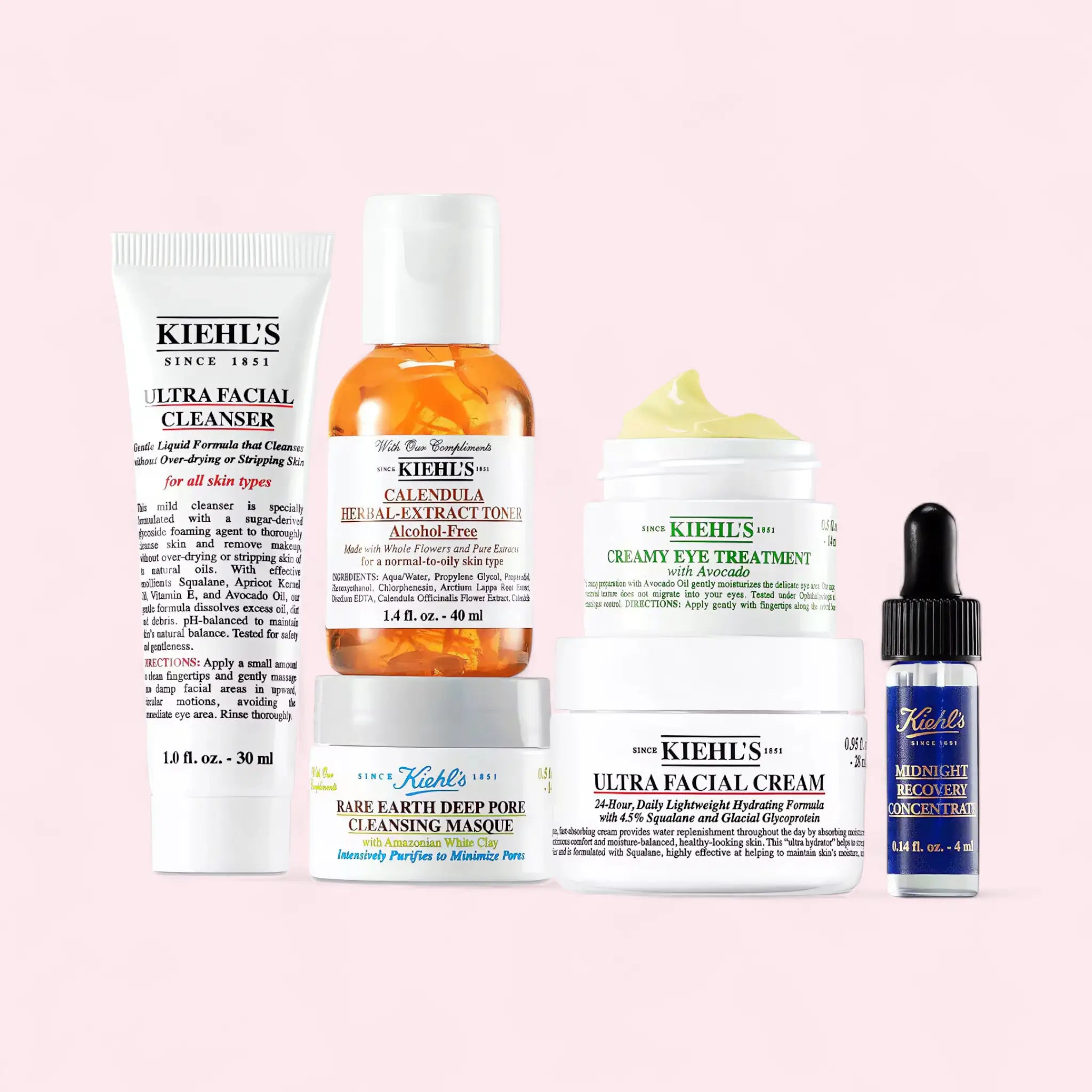 Ultra Facial Cleanser: Aqua/Water, Glycerin, Myristic Acid, Stearic Acid, Lauric Acid, Potassium Hydroxide, Squalane, Apricot Kernel Oil, Avocado Oil, Tocopherol, Phenoxyethanol. Calendula Herbal-Extract Toner: Aqua/Water, Propylene Glycol, Calendula Officinalis Flower Extract, Allantoin, Arctium Lappa Root Extract, Hedera Helix Extract, Phenoxyethanol. Rare Earth Deep Pore Cleansing Masque: Aqua/Water, Kaolin, Bentonite, Aloe Barbadensis Leaf Juice, Glycerin, Amazonian White Clay, Propylene Glycol, Phenoxyethanol. Ultra Facial Cream: Aqua/Water, Glycerin, Squalane, Cyclohexasiloxane, Glacial Glycoprotein, Tocopherol, Phenoxyethanol. Creamy Eye Treatment with Avocado: Aqua/Water, Persea Gratissima (Avocado) Oil, Beta-Carotene, Shea Butter, Tocopherol, Phenoxyethanol. Midnight Recovery Concentrate: Squalane, Lavandula Angustifolia (Lavender) Oil, Oenothera Biennis (Evening Primrose) Oil, Linalool, Geraniol, Tocopherol. (Ingredients may vary by batch. Please refer to the product packaging for the most accurate list.)