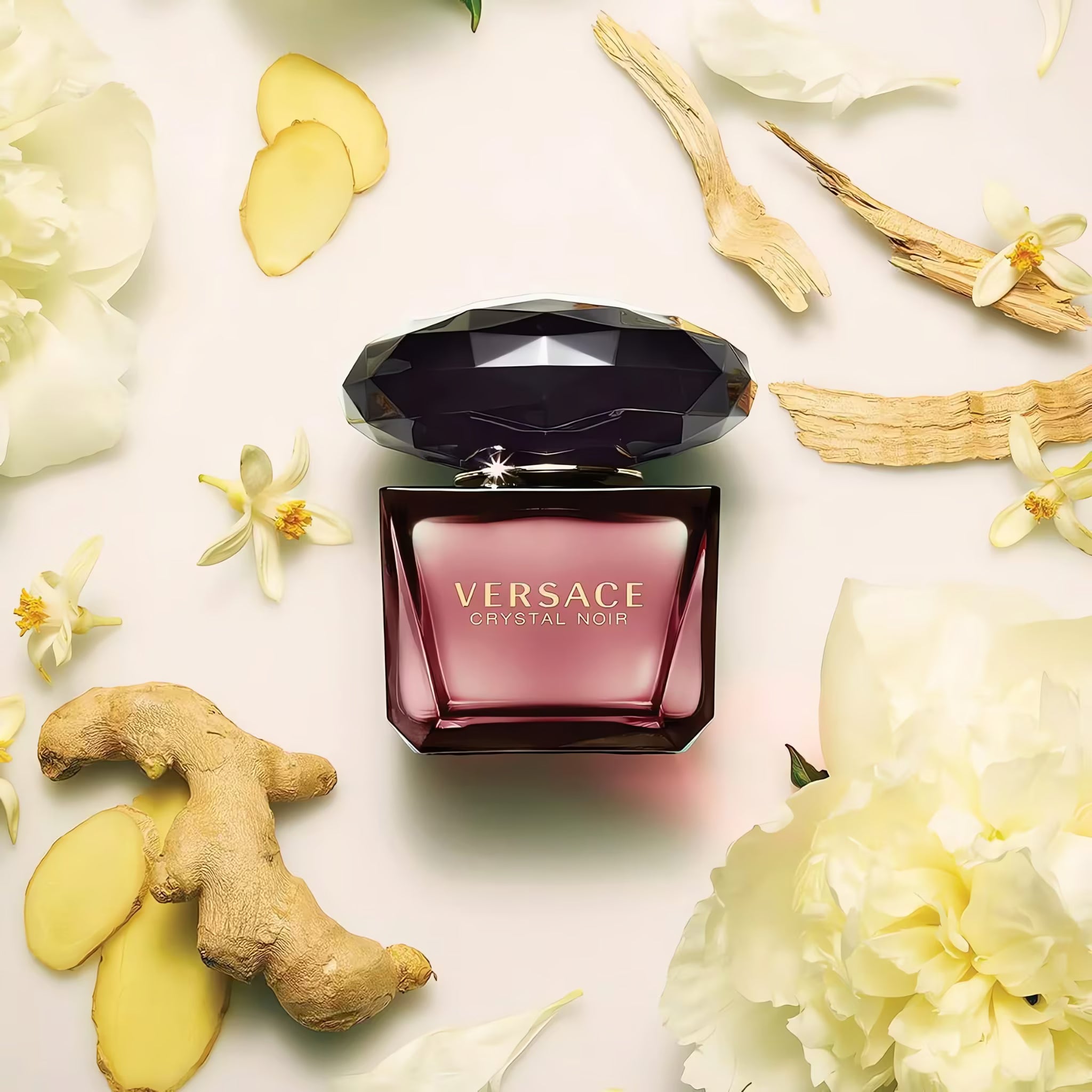 Crystal Noir opens with a luminous blend of ginger, cardamom and pepper, creating a spicy, captivating introduction that instantly intrigues. The heart reveals a bouquet of gardenia, peony and orange blossom, adding a creamy floral depth that feels both elegant and seductive. As the fragrance settles, the base of sandalwood, musk and amber envelops the skin in a warm, velvety trail — sophisticated, intimate and irresistibly feminine.
