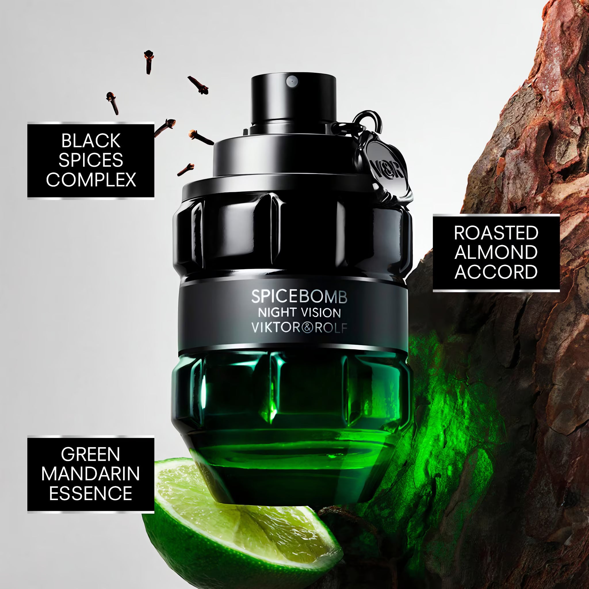 Spicebomb Night Vision opens with an energizing burst of green cardamom, green mandarin, grapefruit and crisp Granny Smith apple, creating a vibrant, luminous freshness that instantly captivates. The heart reveals a bold and spicy blend of black chilli, black pepper, clove, nutmeg, sage and geranium, adding depth, heat and masculine intensity. As the fragrance settles, the base of roasted almonds, tonka bean absolute and woody notes envelops the skin in a warm, seductive trail — smooth, addictive and powerfully magnetic.
